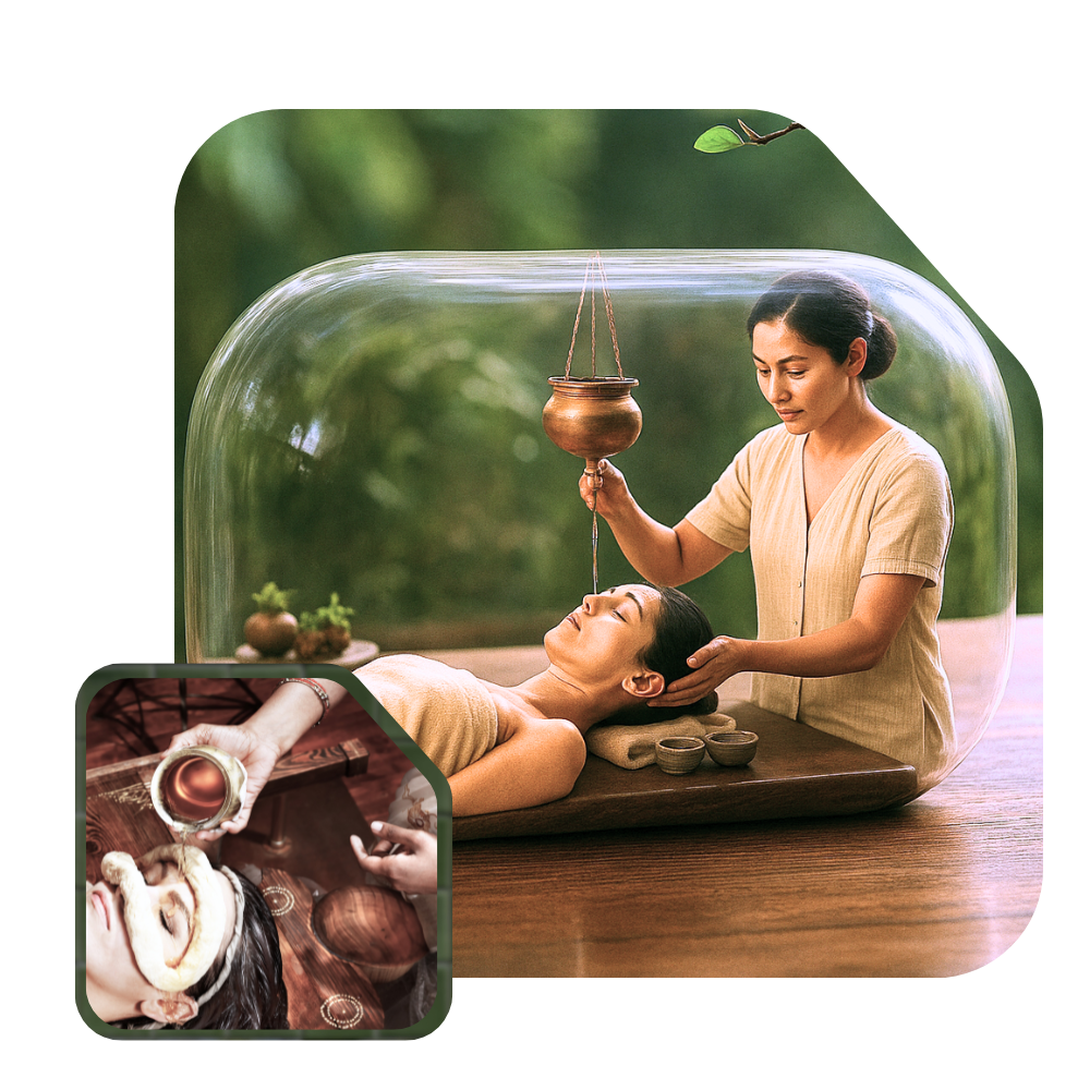 Shirodhara is a profoundly relaxing and therapeutic Ayurvedic treatment that involves a continuous flow of warm herbal oil or